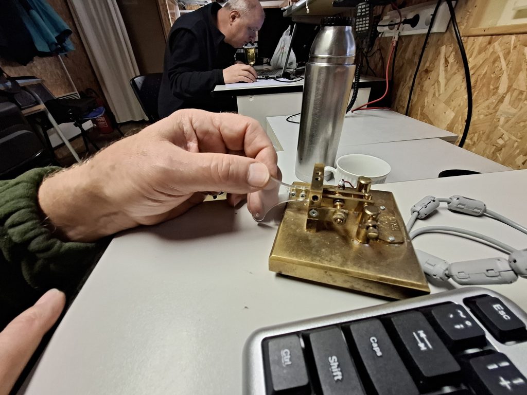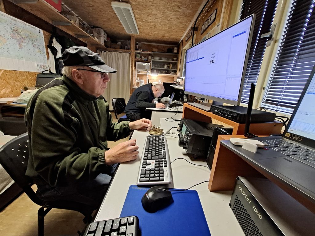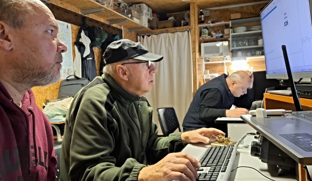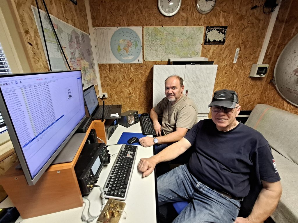 Roman OK1NPF s Honzou OK1MNV sledují zápis v deníku, Vláďa OK1FUJ zjišťuje situaci ve světě