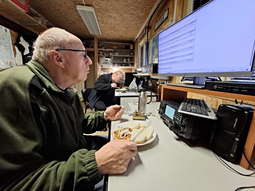 Honza OK1MNV nad porcí guláše sleduje výsledky na internetu
