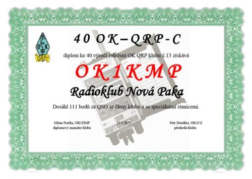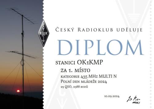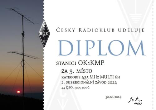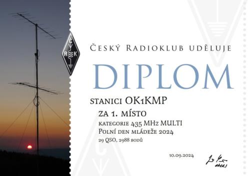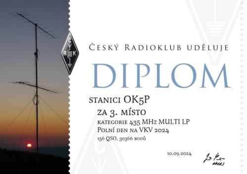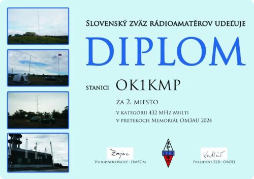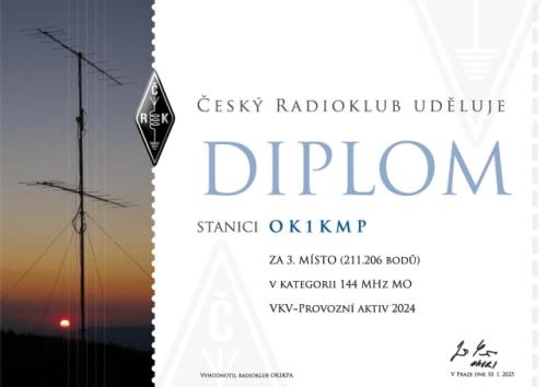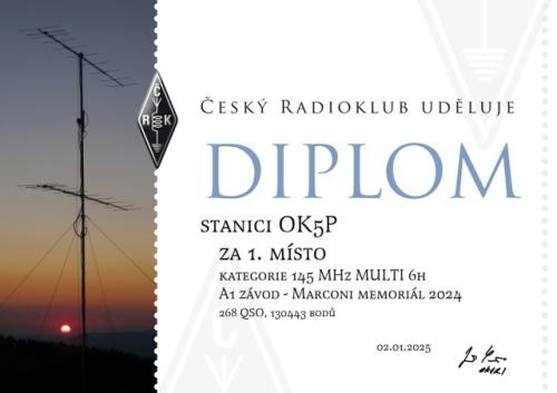 Získané diplomy od r. 2020 Diplomy získané OK1KMP a OK5P v závodech a soutěžích od roku 2020. Diplom za 1. místo v PDM 2023 v kategorii 435 MHz MULTI Diplom za 3. místo v Letním QRP závodě 2023 v kategorii 145 MHz MULTI Diplom za 1. místo v Závodě mládeže na VKV 2023 v kategorii 145 MHz SINGLE Diplom za 1. místo v UHF závodě 2023 v kategorii 435 MHz MULTI 6H Diplom za 3. místo v celoročním závodě VKV Provozní aktiv 2023 v kategorii 145 MHz MO Diplom za 3. místo v A1 závodě 2023 v kategorii 145 MHz MULTI 6H « ‹ z 2 › »